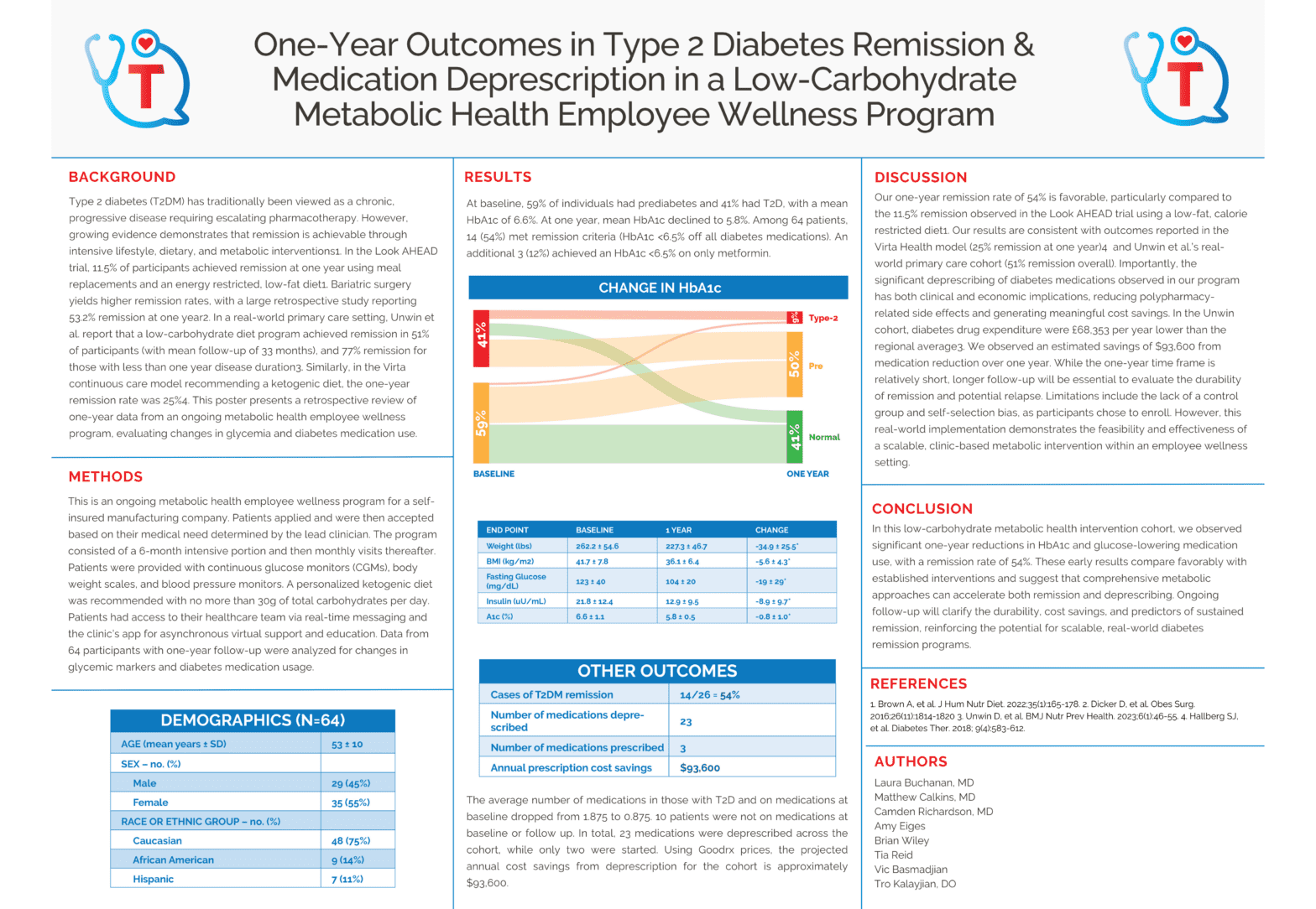 Authors: Laura Buchanan, MD; Matthew Calkins, MD; Camden Richardson, MD; Amy Eiges; Brian Wiley; Tia Reid; Vic Basmadjian; Tro Kalayjian, DO The TOWARD Health team was excited to share new data from its innovative metabolic employee wellness program at the 2026 Society of Metabolic Health Practitioners (SMHP) conference in Boca Raton, FL. The results highlight… Continue reading 54% Type 2 Diabetes Remission at One Year