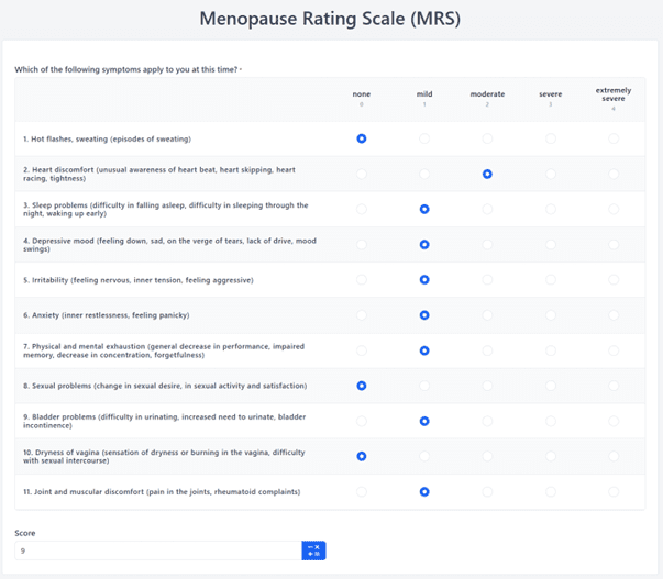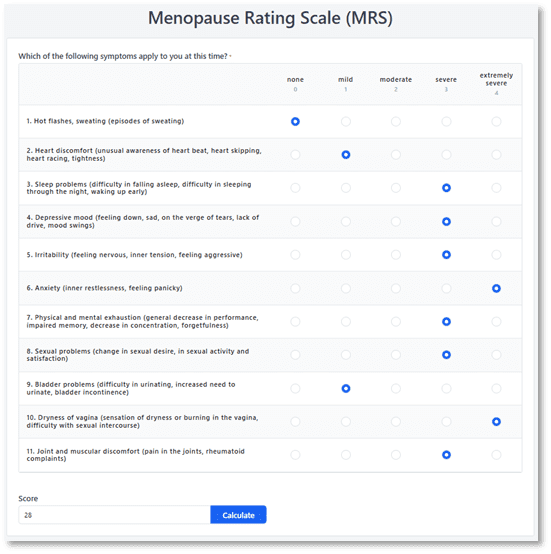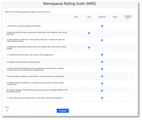 Clinicians may use the Menopause Rating Scale (MRS) to quantify symptom severity across 11 domains: